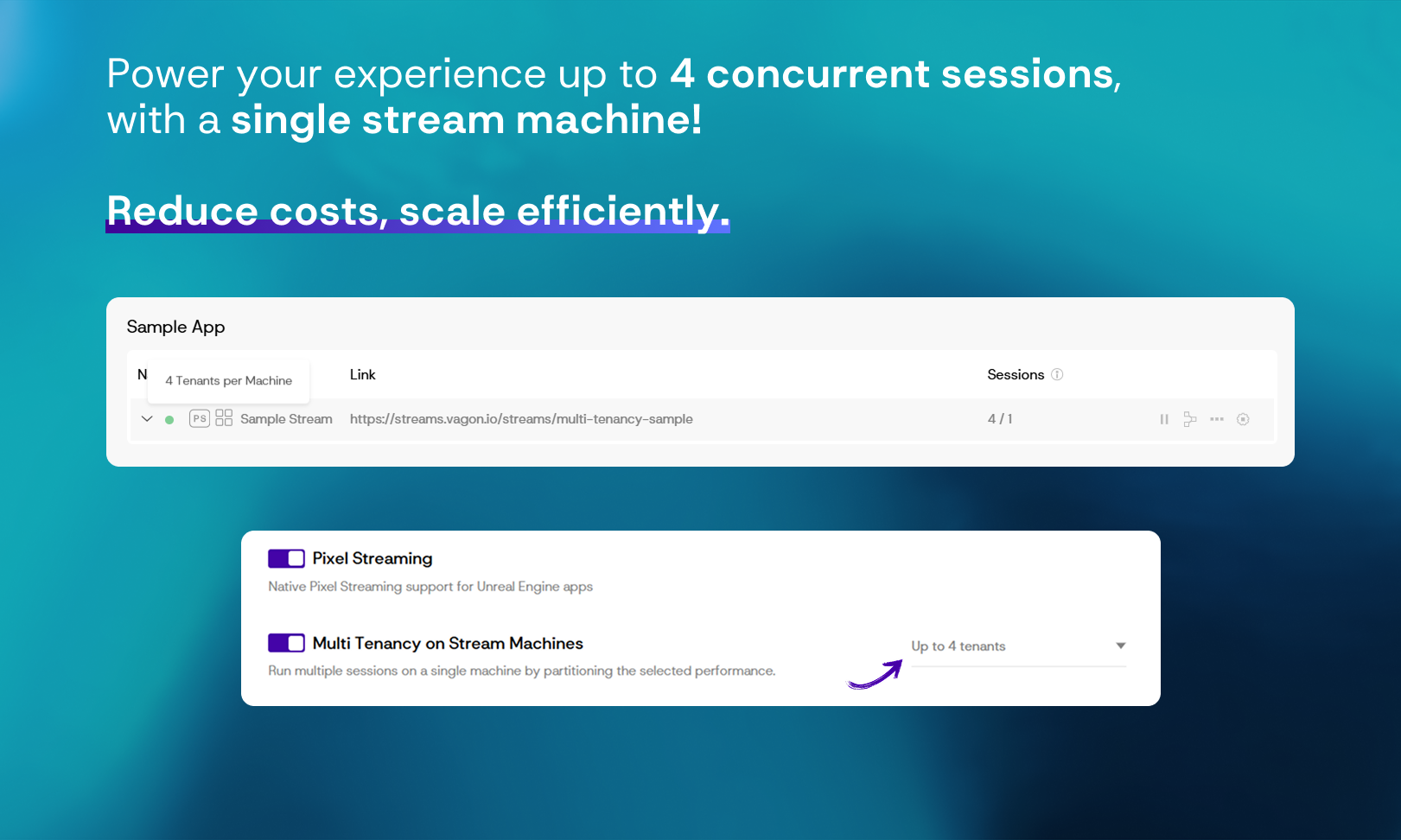 Multi Tenancy makes it possible to run multiple sessions on a single machine by partitioning the selected performance. You can now launch up to 4 sessions from a single Stream Machine and reduce your usage costs by up to 75% with Multi Tenancy.