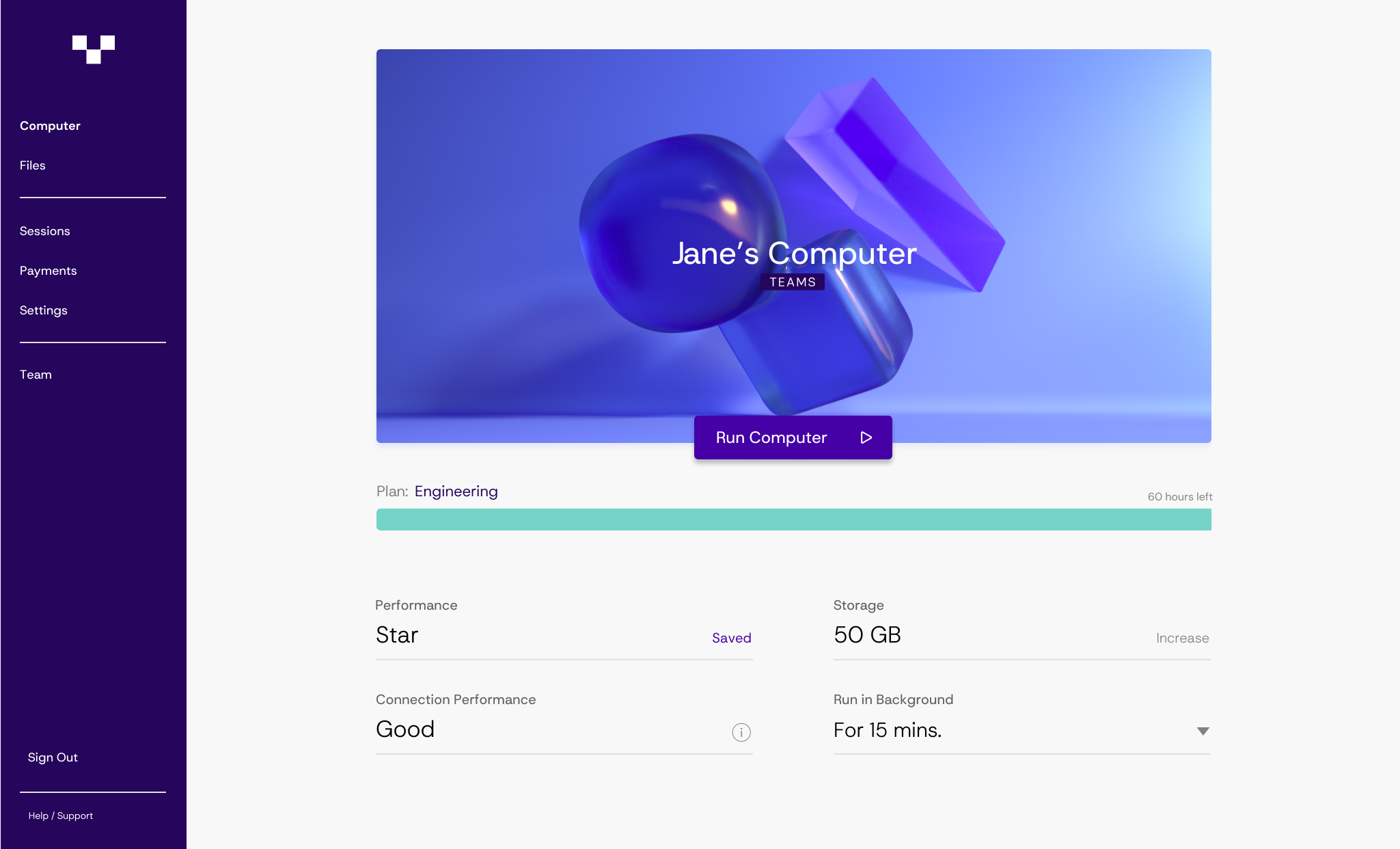 Team Members can use the available performance options and the assigned usages in the Computer Plan in minutes which are defined by the Team Administrator.