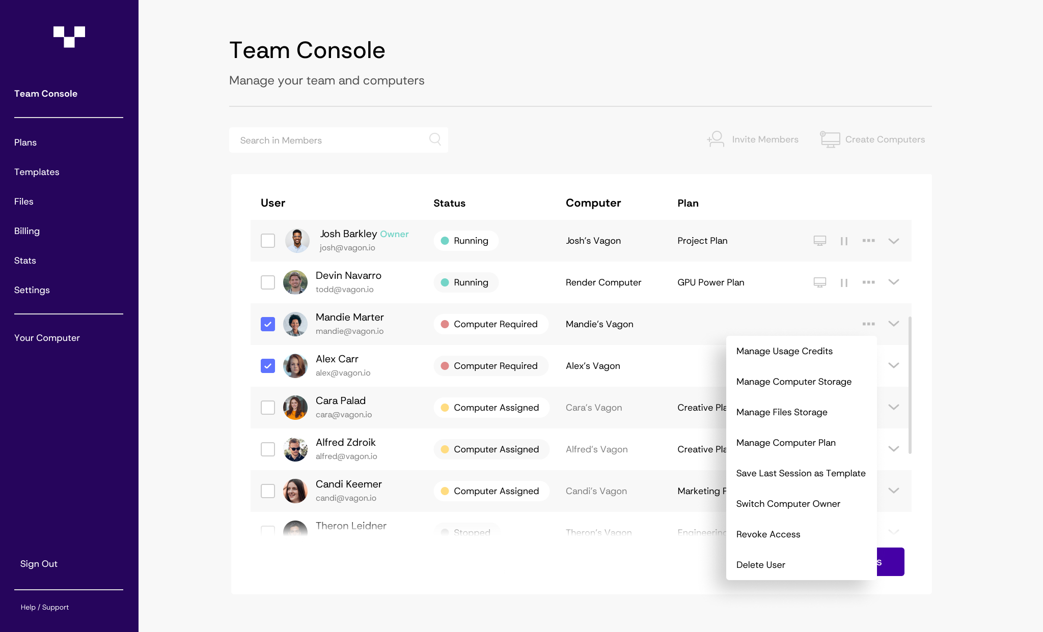 Team Administrators can access all Team Computers and related functionalities from the Team Console. The usage of the Computers will be deducted according to the selected performance option for the Computer.